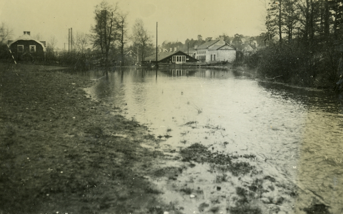 Översvämning vid Villagatan 1944. Vattenverket och tvättstugan i fonden. T.v. hus på gamla Ingarögatan.