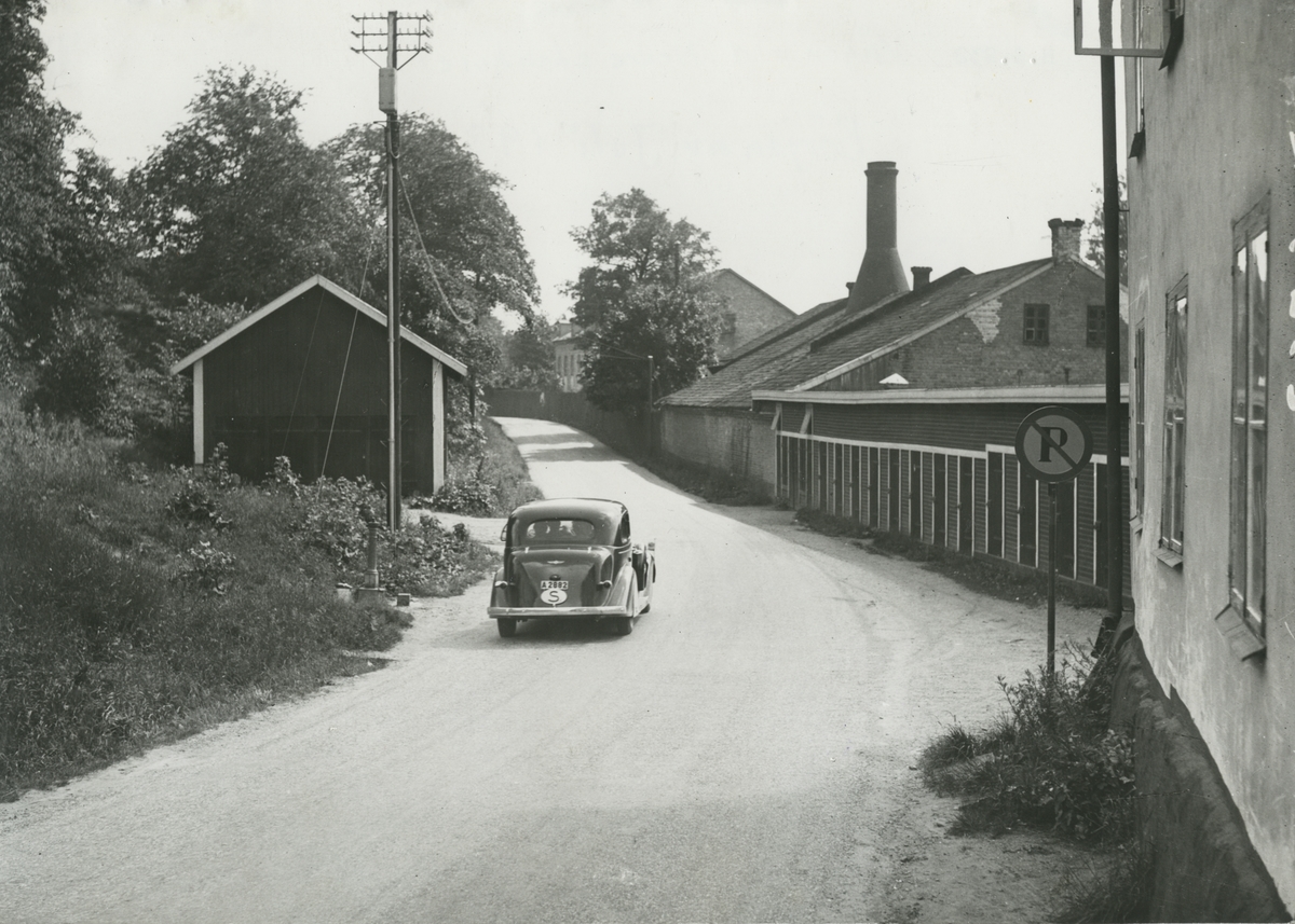 Exteriörbild. Bil vid Algatan, nuvarande Gustavsbergsvägen/Gustavsbergs Allé. Nedre Stenhuset till höger. Längs Algatan avträden och äldre fabriksbyggnader. Bild fotad före 1945. Byggnaderna bortöver är bl a huset för tegelslagning och Formgjuteriet.