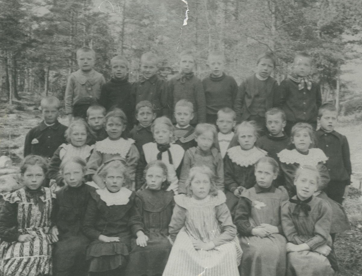 Personer: Övre raden: Emil Andersson, Anders Steen, Gustavsson, Nisse Kock, Berndt Box, Evald Steen, Oscar Dahlqvist<br>Mittenraden: Helge Lindström, Axel Lindahl, Per Lundin, Edvin Fransson, Theodor Jansson, Nils Vickman, Axel Broberg, Karin Hallberg, Svea Schultze, Märta Larsson, Hilma Englund, Lisa Johansson, Magda Hedlund<br>Nedre raden: Astrid Svensson, Alma Gustavsson, Rut Andersson, Ester Magnusson, Ebba Petterson, Ingeborg Wadström, Elsa Rosendal