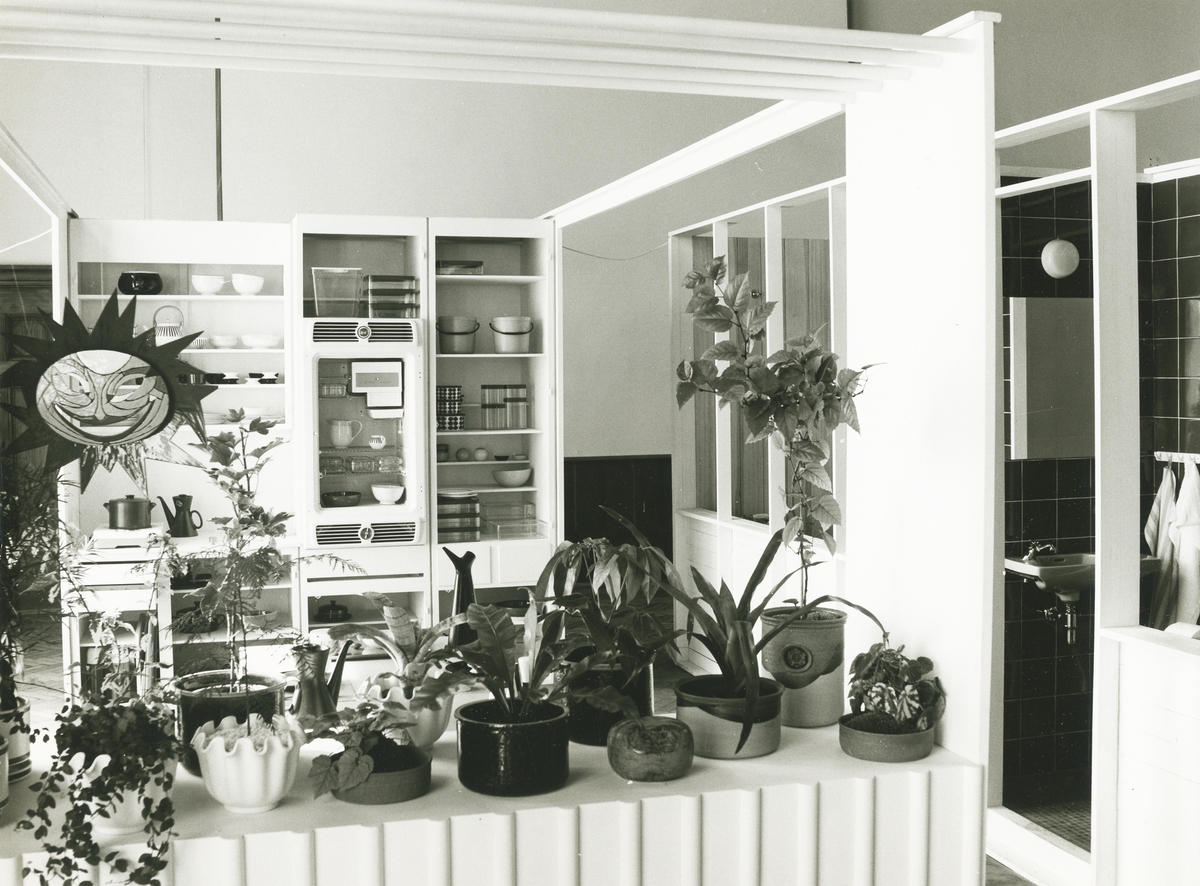 Interiör, Wien. Del av utställningen Kunstlerisches Schaffen und Serienproduktion 1960 på Österrikes konstindustrimuseum.<br>Ytterkrukor för blommor från Gustavsbergs Fabriker.<br>