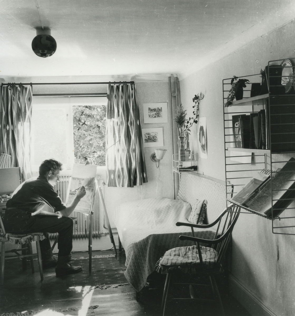 Interiör från Ungkarlshotellet på Mariagatan, byggt 1943. Inredning av arkitekt Olle Thunström och textilkonstnärinnan Edna Martin.