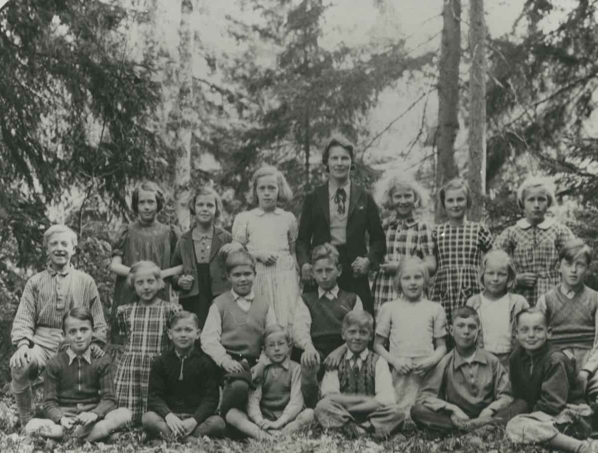 Personer: Övre raden: Britt Norman, Anna-Karin Pettersson, Britta Jonsson, Clary Lindholm, Barbro Gustavsson, Astrid Fredriksson, Ingrid Svahn<br>Mittenraden: Margit Fredriksson, Hans Israelsson, Bror Lönnberg, Ragnar Johansson, Ingrid Pettersson, Barbro Israelsson, Maja Olsson<br>Främre raden, sittande: Bertil Pettersson, okänd, okänd, Arne Fritzell, okänd, okänd, Knut Lönnberg, Astrid Johansson, Märta Englund, Lisa Olsson