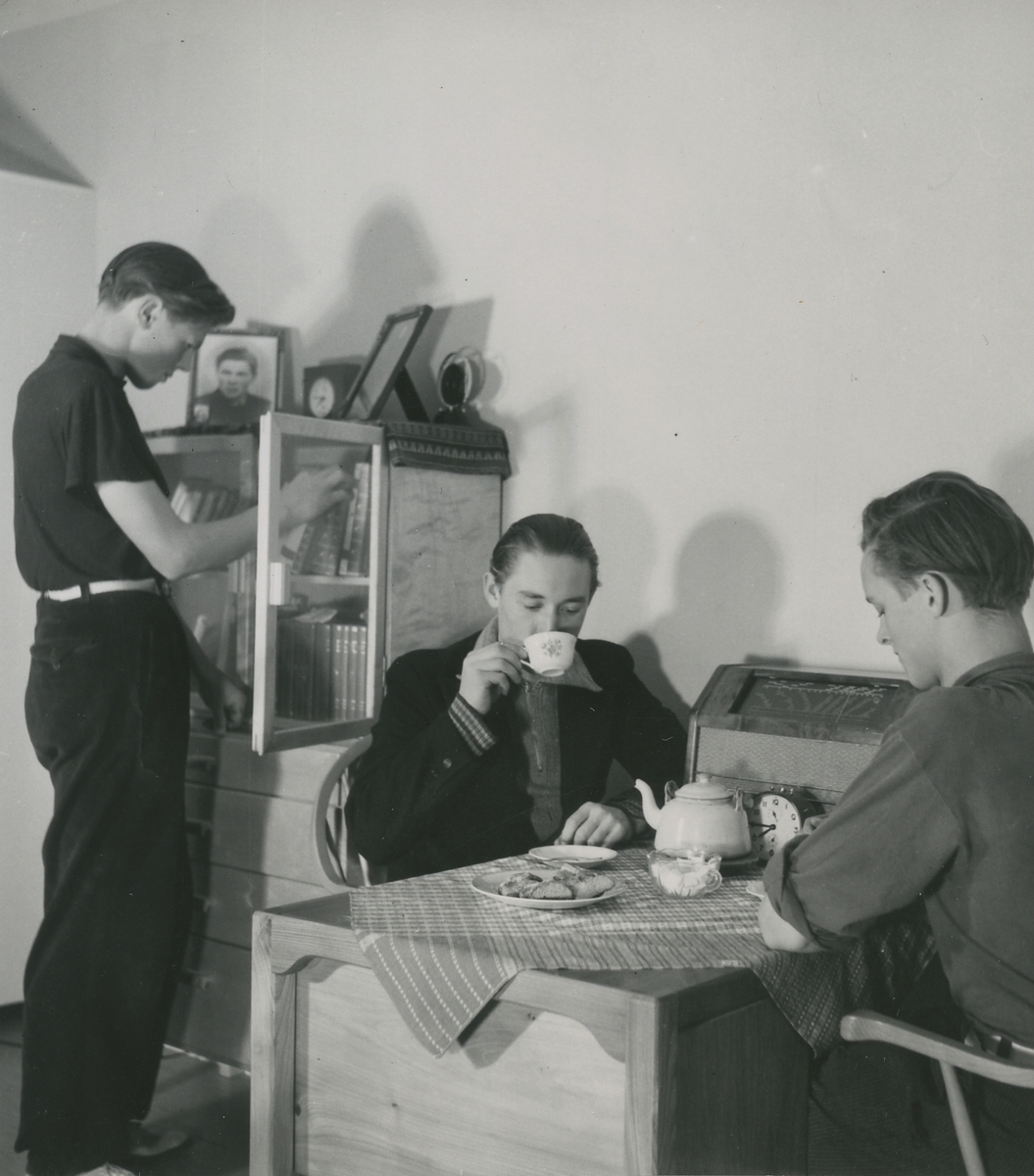 Interiör från Ungkarlshotellet på Mariagatan, byggt 1943. Inredning av arkitekt Olle Thunström och textilkonstnärinnan Edna Martin.