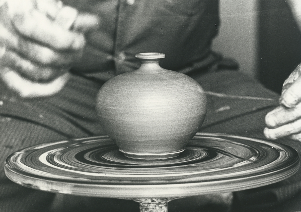 Detaljbild. Gustavsbergs Studio. Borttagning av stengodsvas från drejskivan med skärtråd.