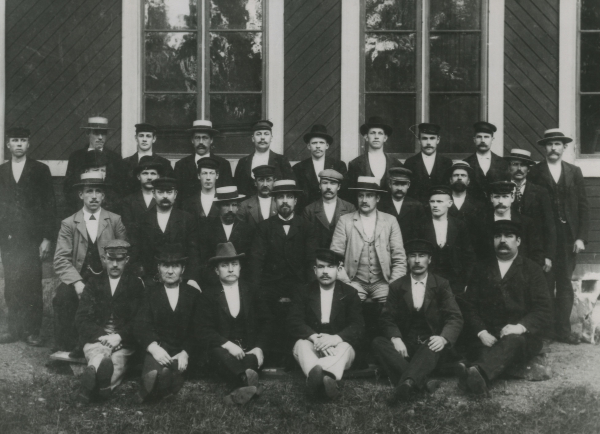 Personer: Från vänster: O R Karlsson gapande Karlsson, August Olsson portolle, Erik Johansson Johansson i äkta, E W Hellström, Konstantin Flink, Aug Bonnevier, August Söderman, A G Berglind Gockkock, okänd, Henning Andersson, A Blom, okänd, Ernst Nordkvist, Knut Holmberg, maskinist C Johansson, August Blomkvist, C A Olsson stockholmsolle, Mauritz Säfström, kyrkvakt Nilsson mitt lilla mitt, Robert Fredblad, C E Algulin, styrman Jonsson, John Severin, Frans Andersson Frans luden, Viktor Karlsson, Emil Steen, Frans Johansson, Hamlet Lowndes (?), Anton Nordkvist, Alfred Gehlin, Carl Flodmark, Ernfrid Hedblom, okänd, Carl Rolf, Robert Severin, Per Hedblom (far till Ernfrid), August Ström, okänd, Frits Gustavsson sillen, Carl Ekberg, C J Rystedt, Carl Flink, Viktor Söderman och kusken Andersson.<br>