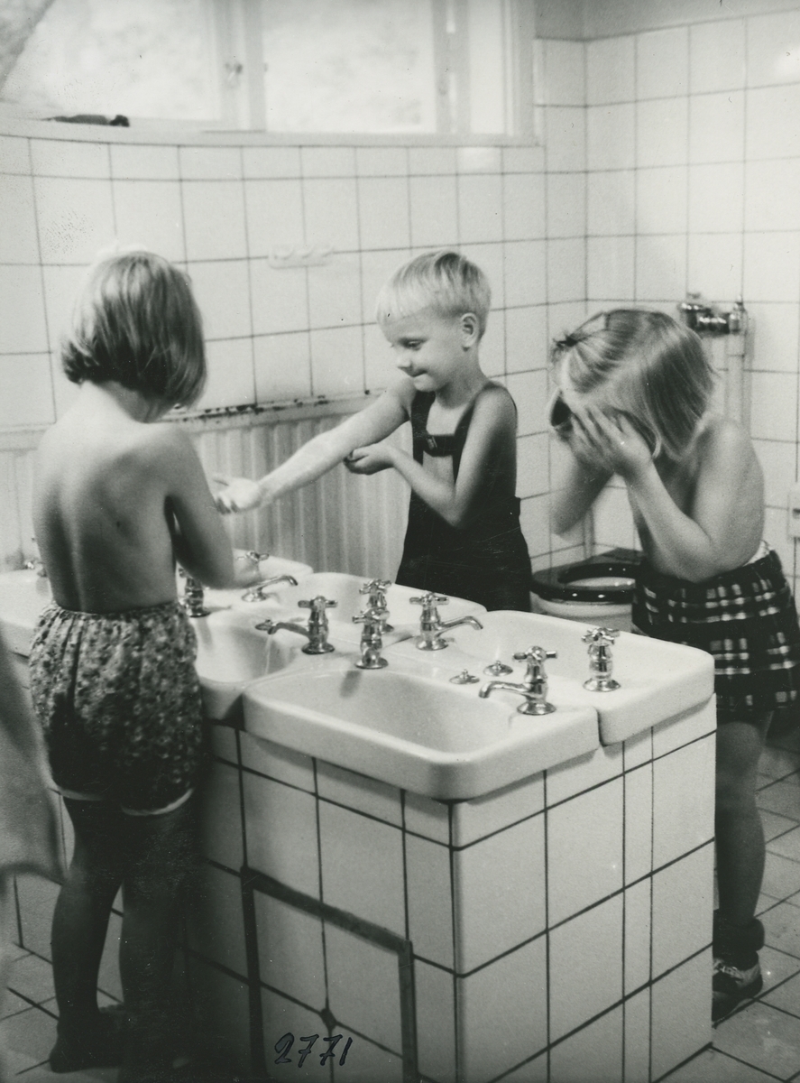 Interiörbild. Daghemmet Blomkulan. Tvagning i tvätt och wc-rum.