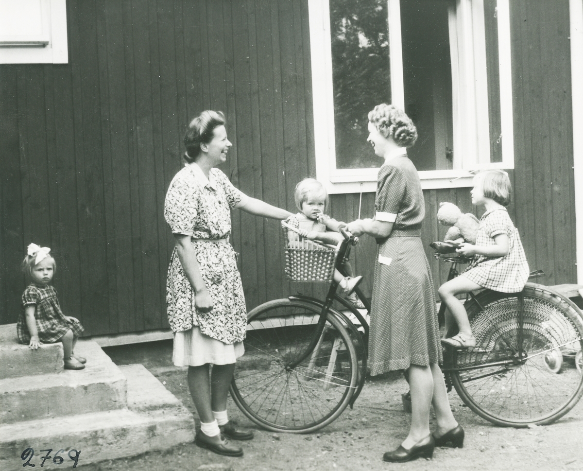 Personer: Fröken Elna Davén och Anna-Lisa Skånberg med döttrarna Birgitta (pakethållaren) och Christina (i korgen). Övrig okänd