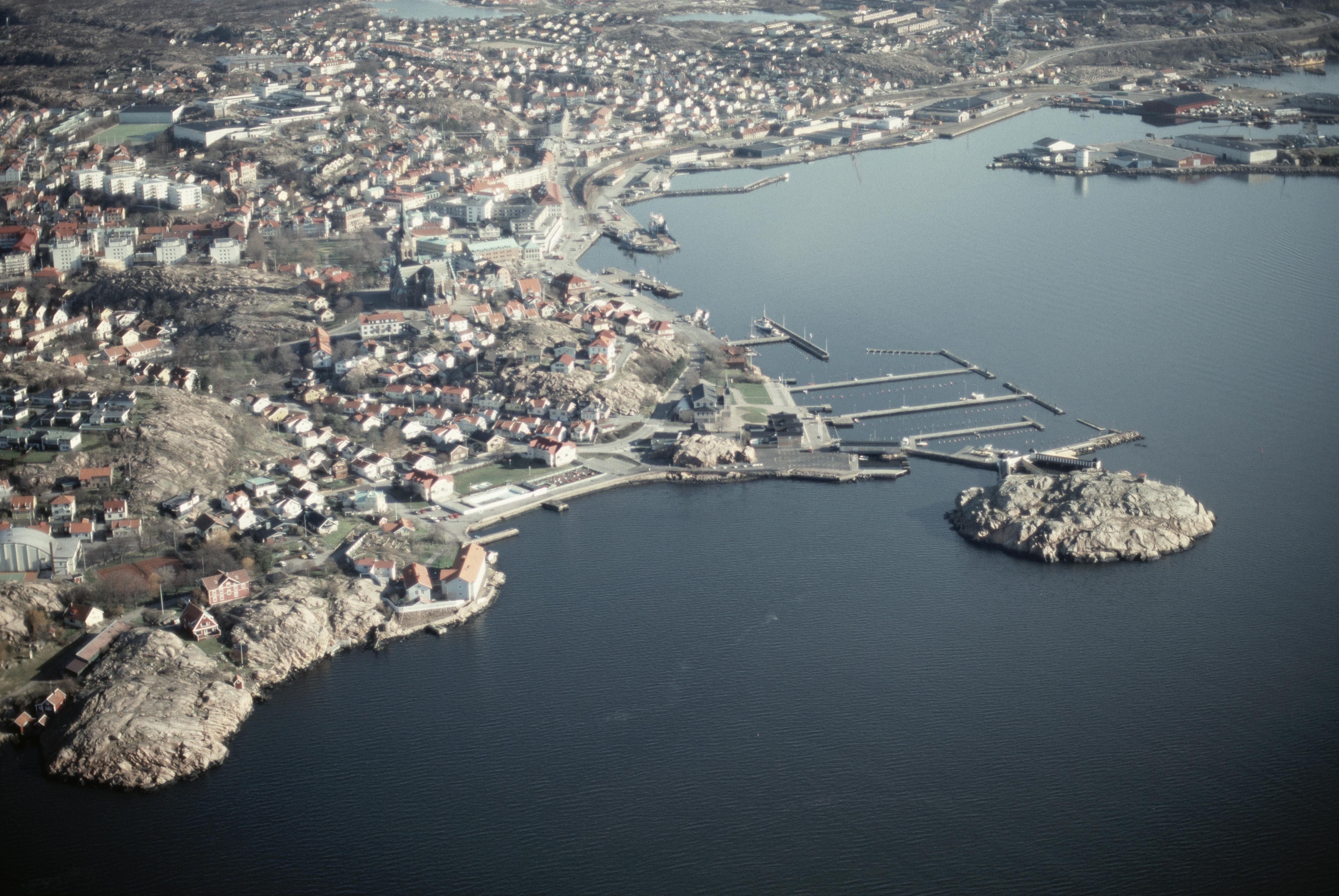 Lysekils stad. Släggö vid Lysekils södra hamn. Lyse kyrka till vänster om bildens mitt. Bilden är tagen mot (väderstreck): NO