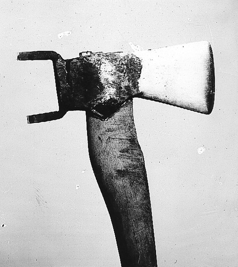Yxa med fasthållningsanordning för pappersved vid barkning.