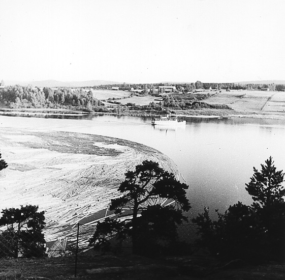 Vy från Kollsbergsudden mot Västanvik. S/S Selma Lagerlöf passerar.