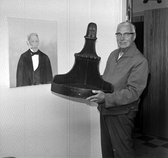 J A Henriksson, Östmark, uppvisar gåvor som skänktes till Purastorps rökstuga av Carl Axel Gottlunds sonson, överste A W Gottlund, Tavastehus, en piphylla förfärdigad av farfadern, samt en oljemålning som han målat av sin farfar.