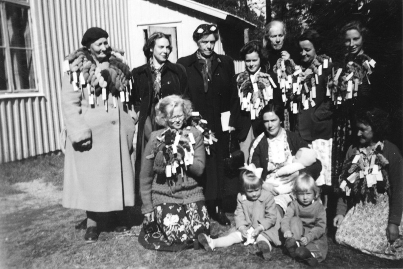 Växtfärgningskursens deltagare i Lekvattnet har draperat sig i sina färgalster.