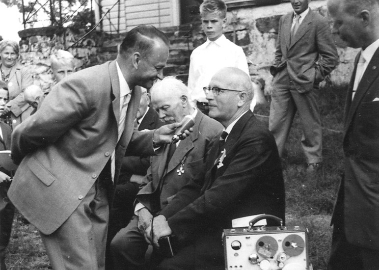 Fr v: Reporter från Finlands radio, "Niittaho-Jussi" Johannes Johansson, Sigurd Bograng, folkskolläraren Pekkarinen