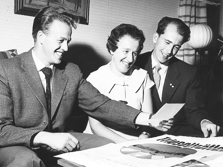 Trivselträffens "Cabaré på tre" Bengt Jonsson och Marit Berglund, Torsby och Arne Karlsson, Persberg studerar affisch o. flygblad för turnén.