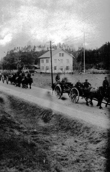 Militärer dra söderut genom Elindebol, Norra Ny. I bakgrunden Per Håksas gård.