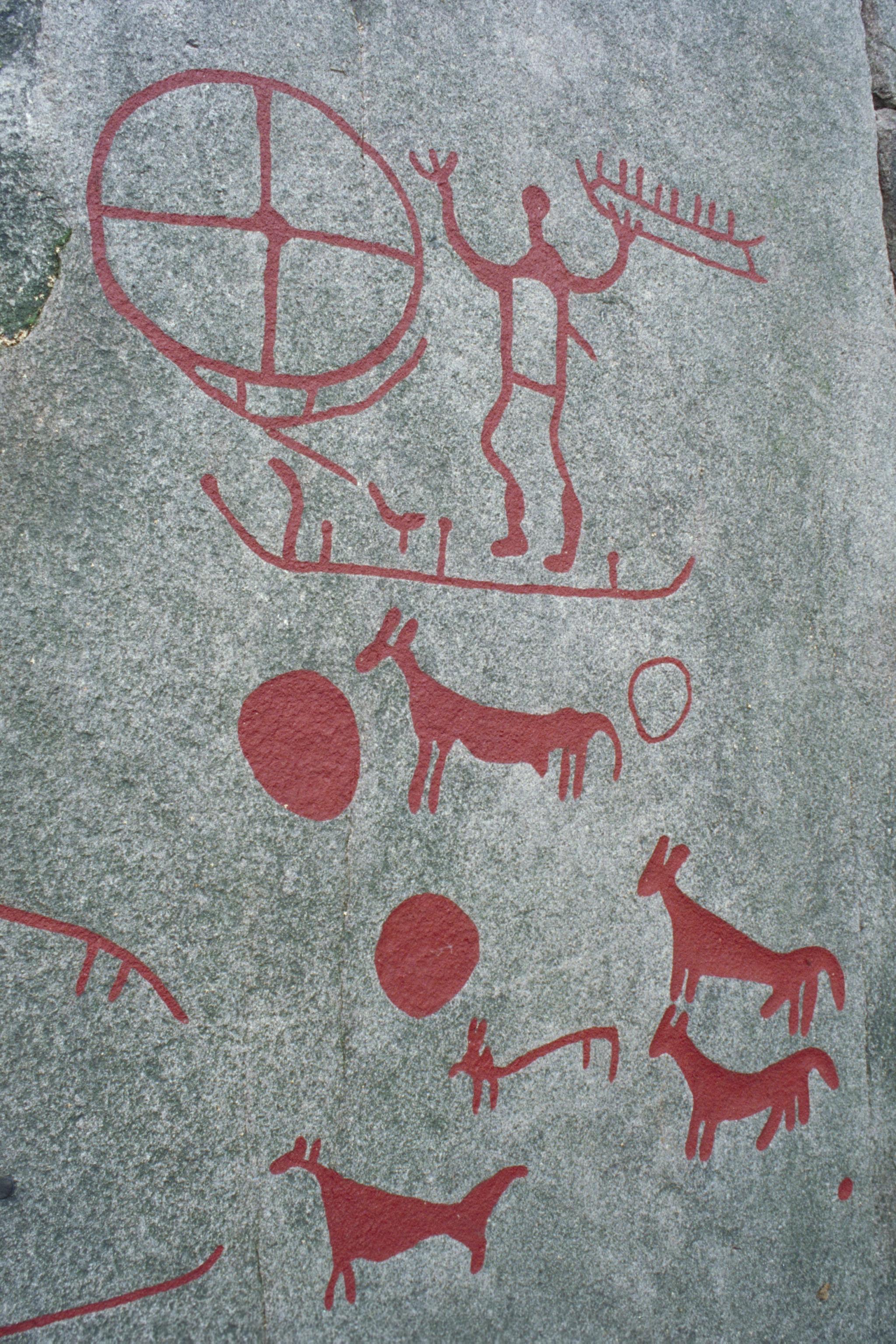 Djur, solkors, skepp, människofigur. Tossene 73:1.