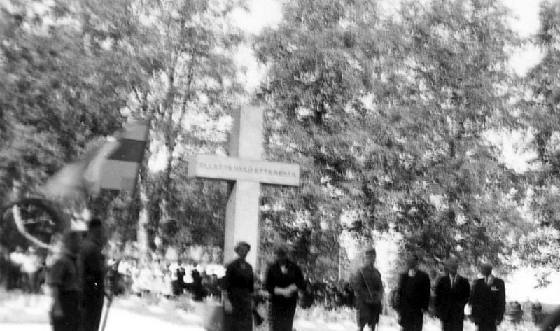 T.v löjtnant Erkki Kilpelä och fänrik Osmo Noponen paraderande. T.h Hakamies, f.d prosten i Juva och president Uhro Kekkonen.