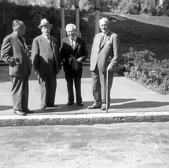 Fr v: J A Henriksson, "Nitaho-Jussi" Johannes Johansson, professor Lauri Kettunen, redaktör Bror Finneskog.