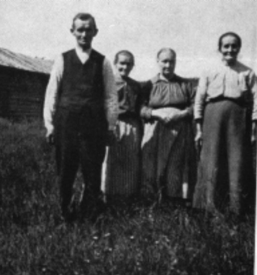 Fr.v "Juhola-Jussi" Johannes Jonsson, Maria Jonsson, pigan Maria Henriksson från Raiski, Mina Jonsson.