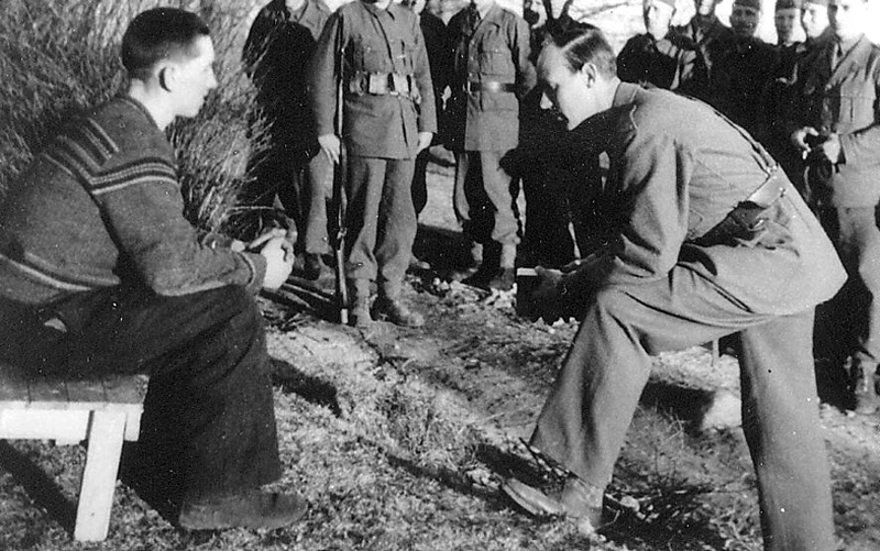 Rysk krigare som gått över gränsen från Norge och kommit till Oppigården, Flatåsen. Kortet är dramatiskt. Här blir ryssen förhörd av löjtnant Hjalmar Rosenblad. Ryssen var så rädd att han skulle bli skjuten, men han följde med ner till fru Heidenreich, Vägsjöfors herrgård, som kunde ryska pga sin ryska börd. Där kunde allt förklaras och ryssen blev så glad. Han blev förd till Filipstad. Hans vidare öde är okänt.