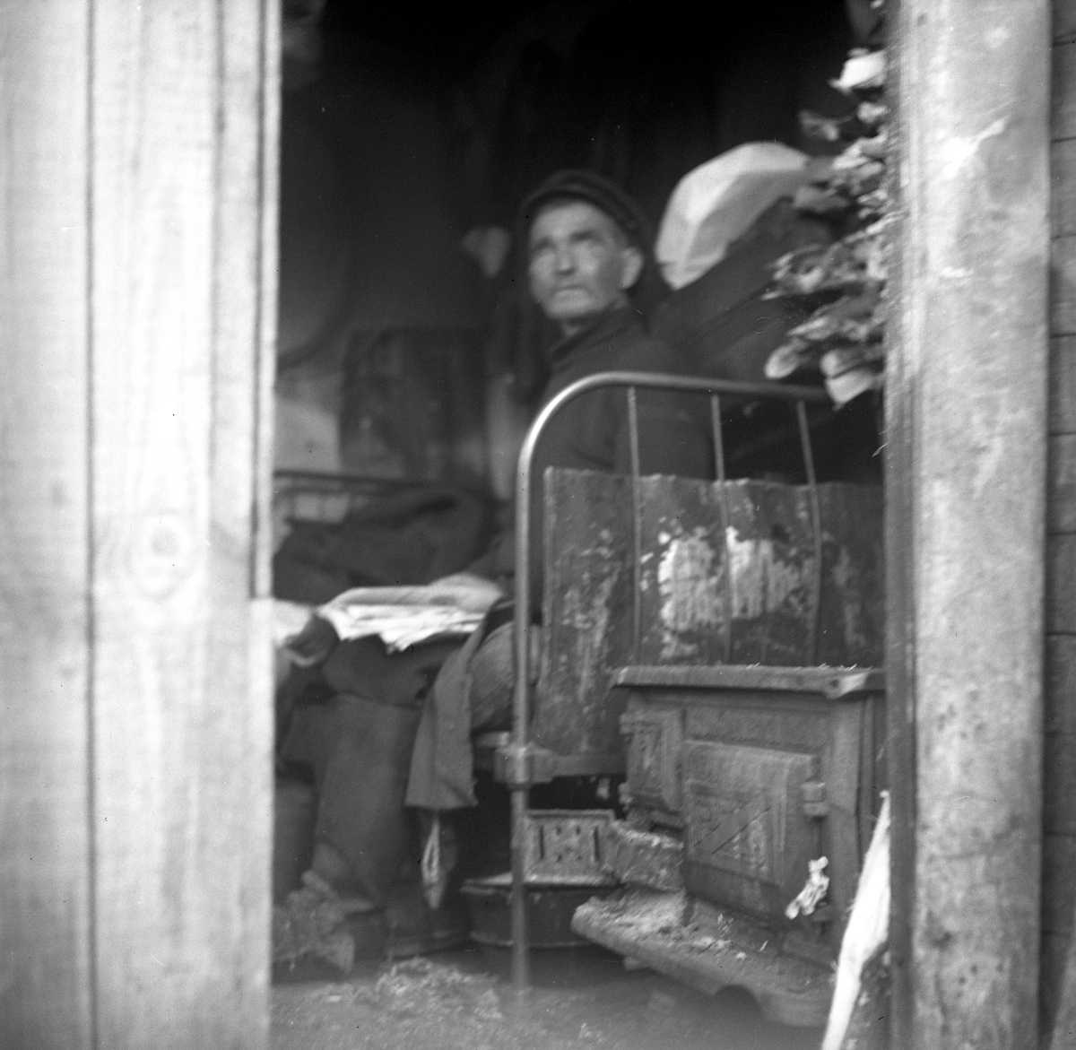 Titel: Bror och Karl Andersson i sin hemsnickrade stuga som var tillverkad av lådor från J P Nyströms orgelfabrik och låg på Kaplansholmen i östra älvgrenens delta. De gick även under namnen "Brollan" och "Kalle Geta". Bröderna livnärde sig som fiskare och sålde dagens fångst vid strandhugg inne i Haga. Mer att läsa om bröderna finns i Morgan Larssons bok: Karlstadsoriginal. Bilden togs 1941.