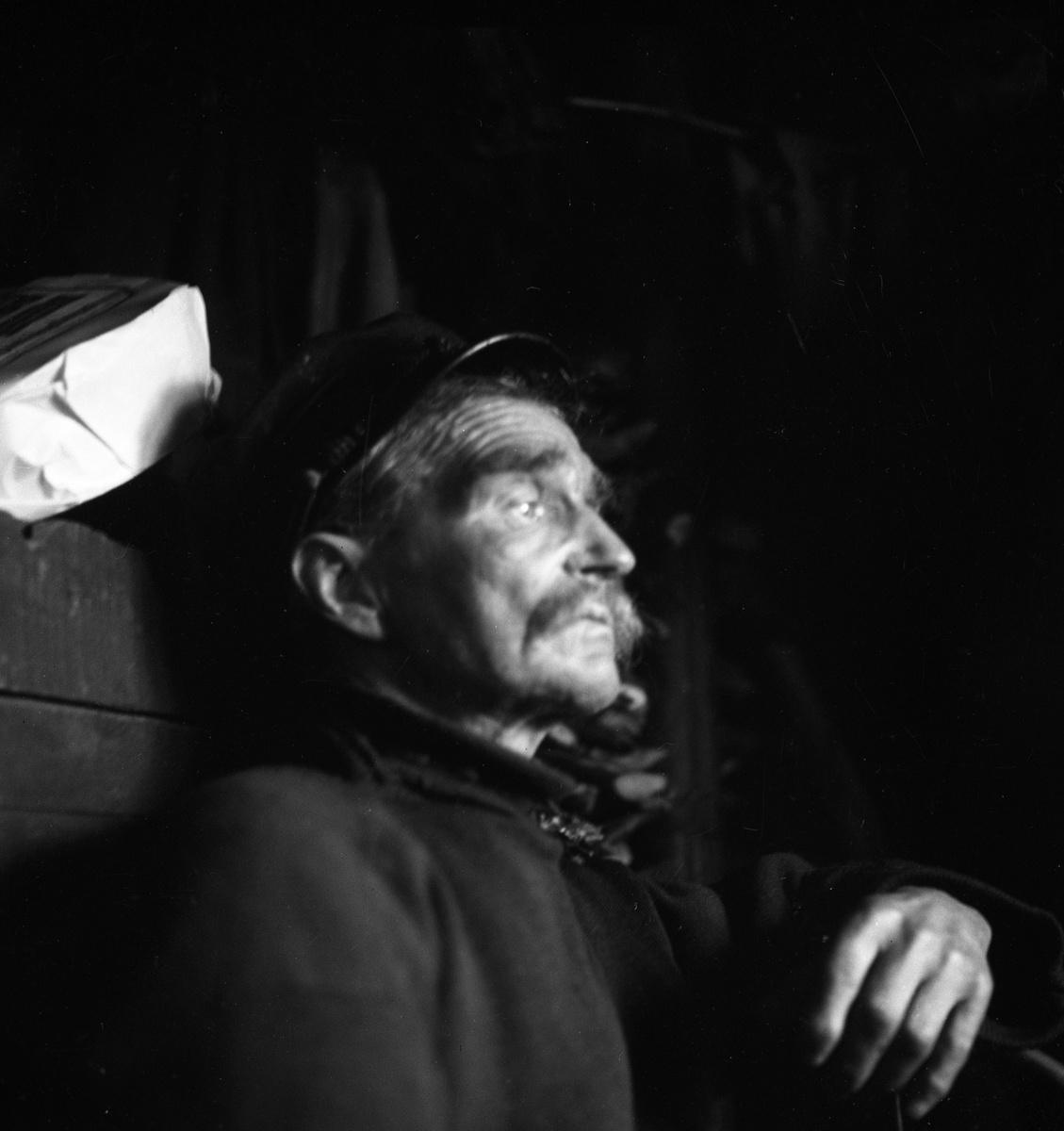 Bror och Karl Andersson i sin hemsnickrade stuga som var tillverkad av lådor från J P Nyströms orgelfabrik och låg på Kaplansholmen i östra älvgrenens delta. De gick även under namnen "Brollan" och "Kalle Geta". Bröderna livnärde sig som fiskare och sålde dagens fångst vid strandhugg inne i Haga. Mer att läsa om bröderna finns i Morgan Larssons bok: Karlstadsoriginal. Bilden togs 1941.