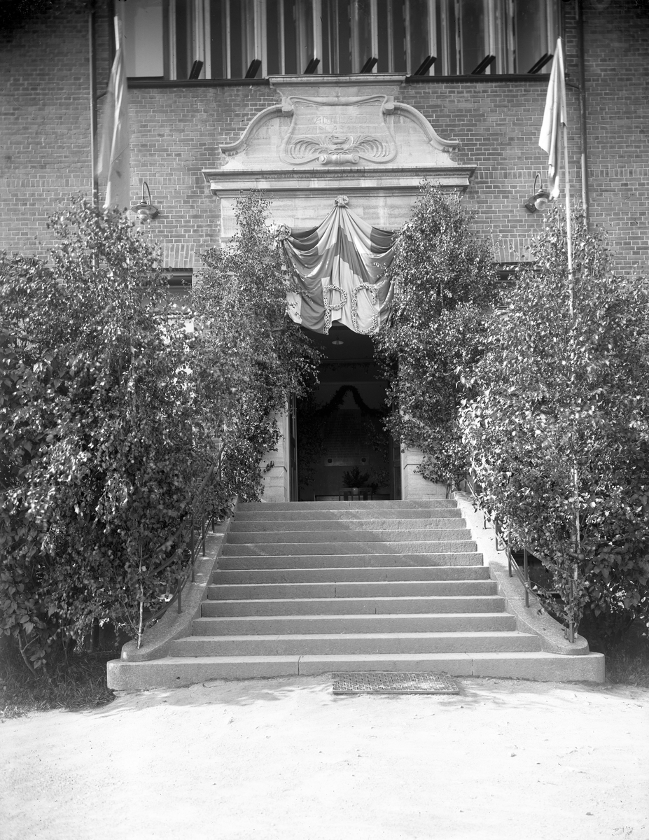 Bildsvit från länslasarettet med omgivningar tagen mellan 1905 och 1961. Huvudentrén utsmyckad med anledning av firandet av överläkare Per Clarhoms avgång från tjänsten år 1928.