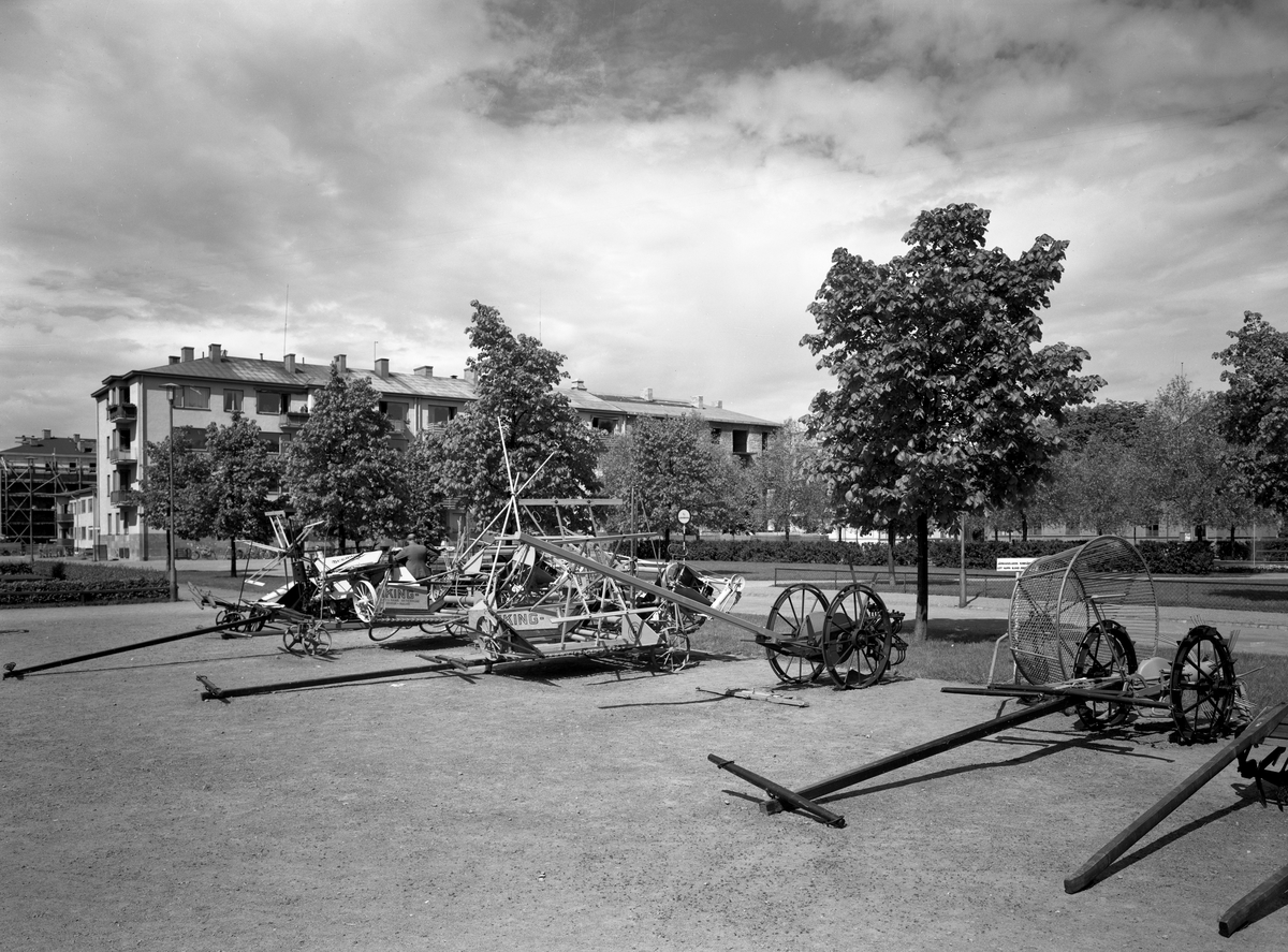 Värmlands och Dalslands järnhandlarförening anordnar en utställning av jordbruksredskap på Malmtorget i Klara 1944.