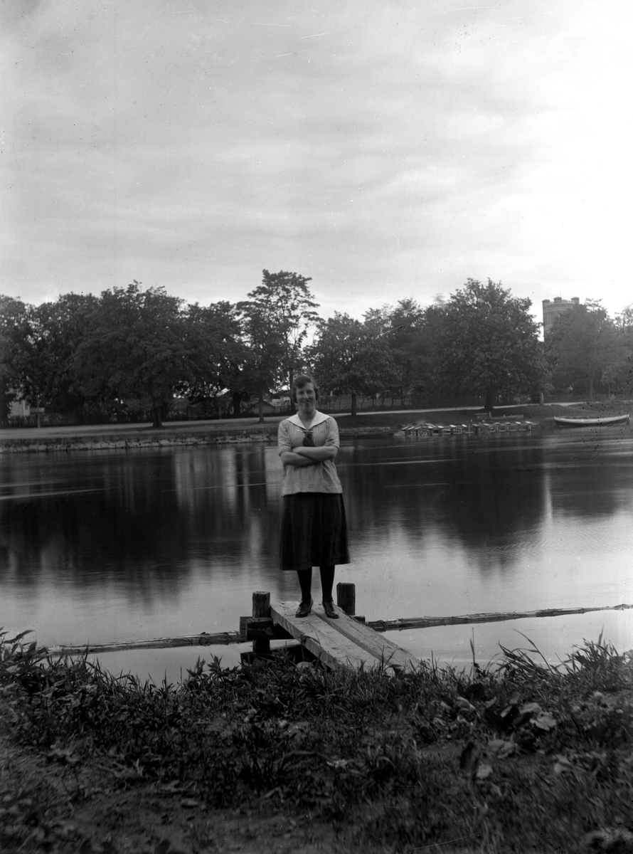 Okänd dam vid Klarälven på 1920-talet. I bakgrunden ses en klappbrygga för tvätt eller sköljning. En tidigare konstruktion för liknande ändamål låg nedanför teatern fram till 1903.
