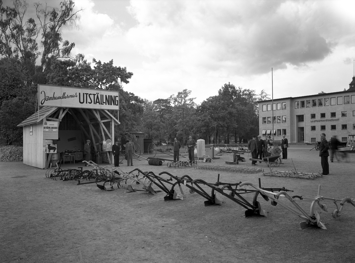 Värmlands och Dalslands järnhandlarförening anordnar en utställning av jordbruksredskap på Malmtorget i Klara 1944.