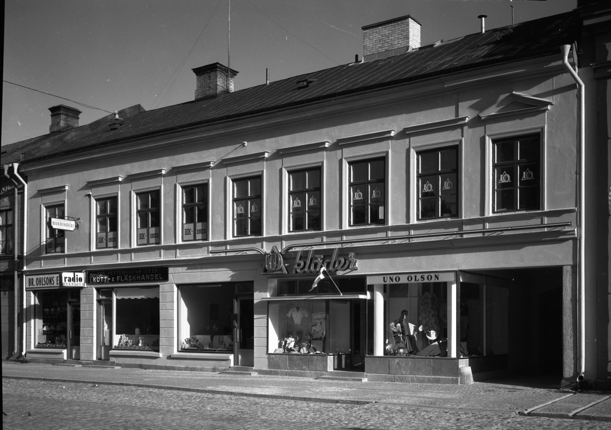 Uno Olssons Herrekipering på Drottninggatan 23 i kvarteret Duvan år 1945. Huset revs i mitten på 1980-talet.