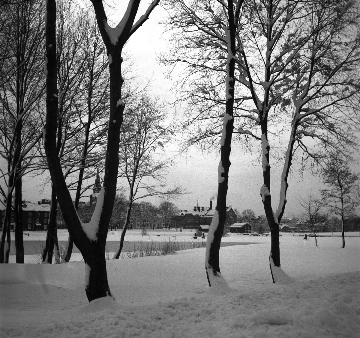 Vinterbild. tagen någon gång under kriget, från Sundsta mot hyttaområdet och gamla badhuset.