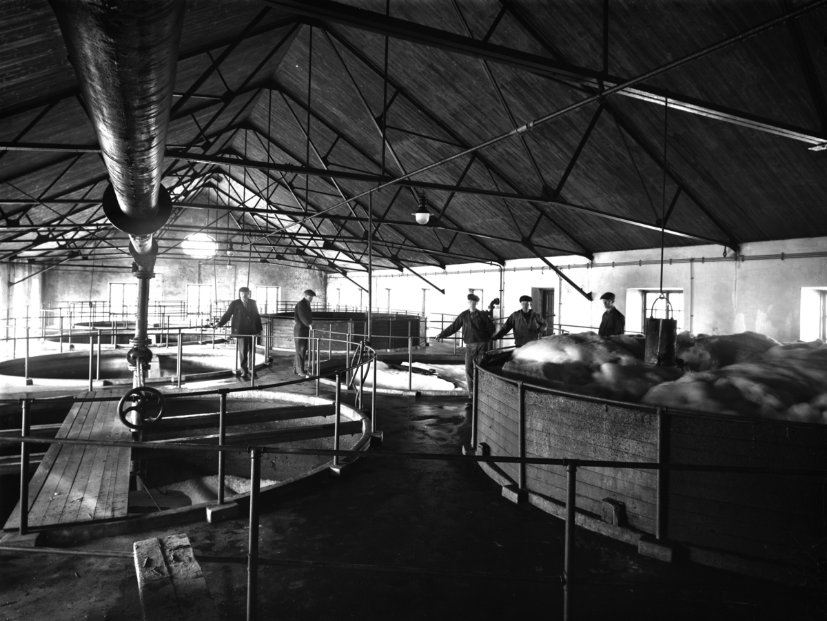 Interiör från Skoghallsverkens spritfabriks sal med jäskar.