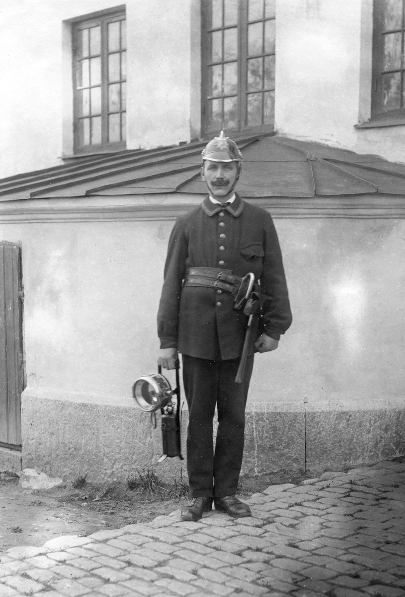 En serie bilder med anknytning till Karlstads Brandkår. En gasdriven handlykta hanteras av denne man.