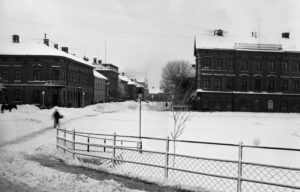 Residenstorget och Järnvägsgatan en snörik vinter runt förra sekelskiftet. Huset till vänster byggdes på med 2 plan år 1911.