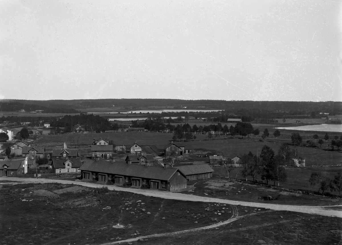 Vy över Herrhagen norrut från vattentornet år 1890. I bakgrunden syns från vänster: Svinbäckens gård, Åttkanten på sin ursprungliga plats bortom nuvarande stickspåret till hamnen, Kroppkärrs skola och herrgård. Mitt i bild, den i folkmun kallade "liggande skyskrapan", revs 1932 och var då den sista kvarstående nödbostaden som uppfördes efter branden 1865. Fläckigt original.