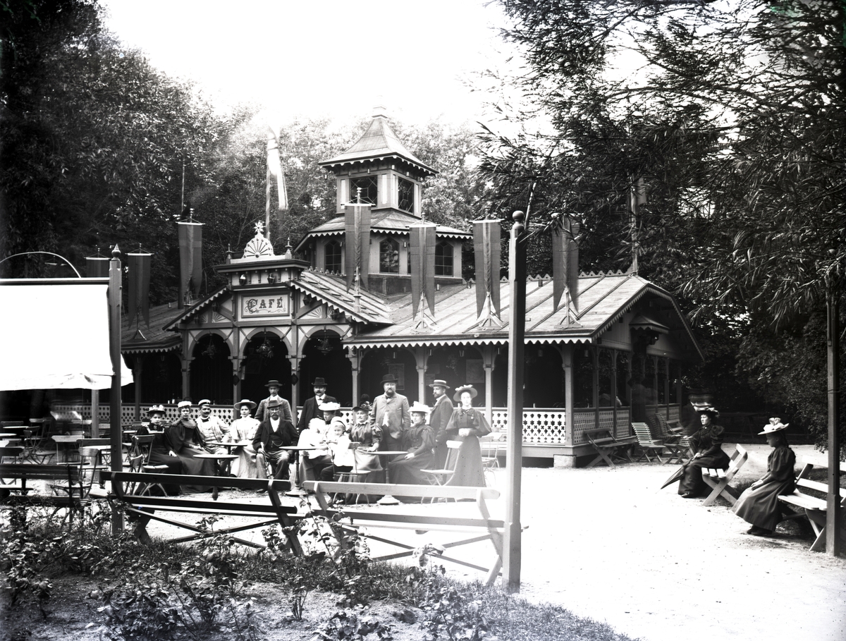 Titel: Bild tagen i Karlstad, eventuellt vid Värmlands Hushållningssällskaps utställning i Klara 1895 och visar i så fall cafépaviljongen i Våxnäsparken. I sällskapet syns J P Nyström, ägare till orgelfabriken med samma namn.