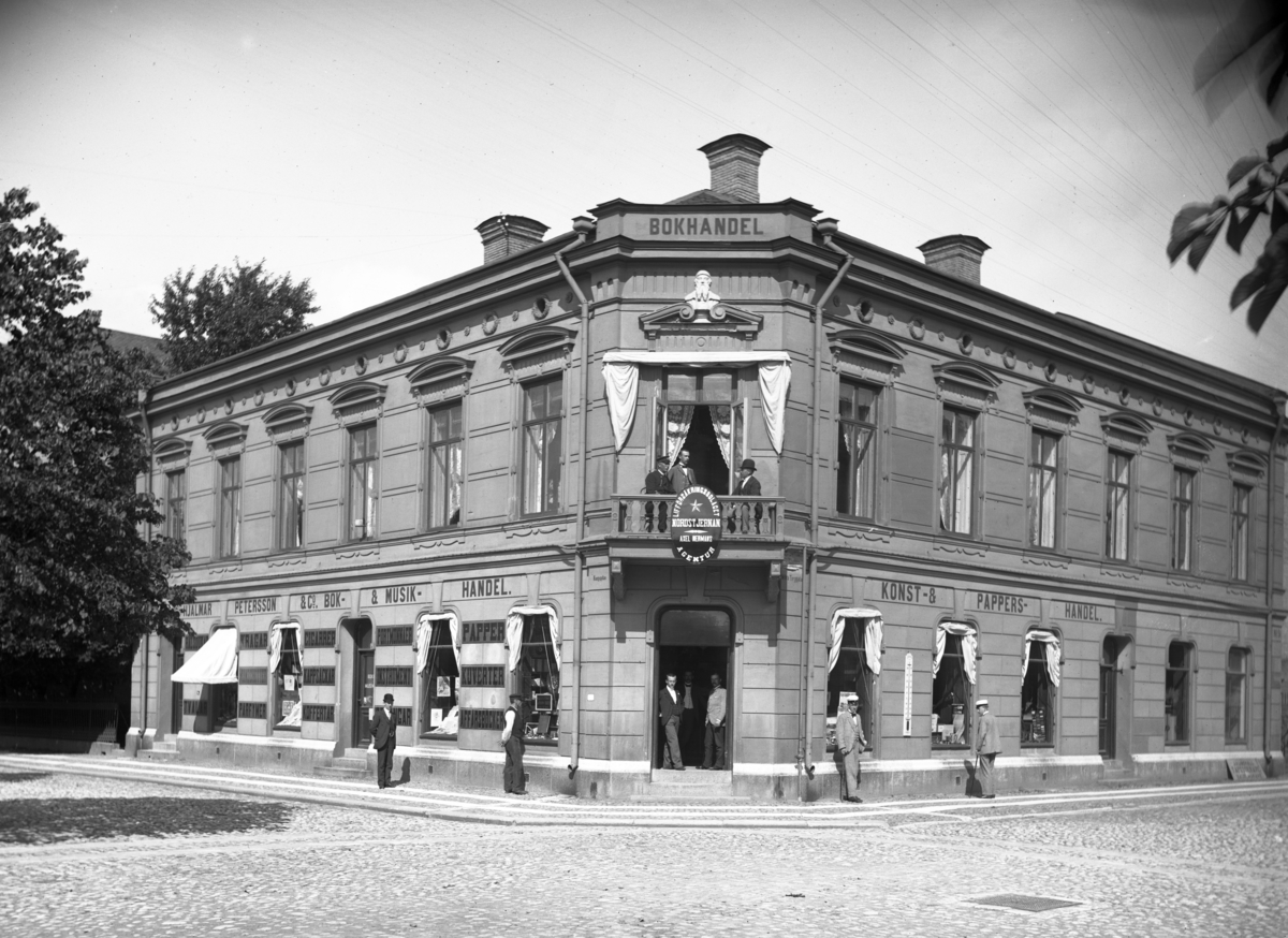 Hjalmar Peterssons bokhandel m m i hörnet Kungsgatan–Västra Torggatan på en bild tagen några år in på förra seklet.