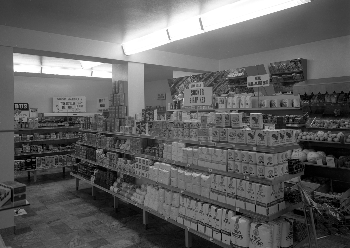 Bildsvit från Frits Thybergs speceriaffär på Kvarnberget, kanske ett av Karlstads första snabbköp. Butiken fanns på Jössegatan 7 där ett politiskt parti nu är hyresgäst. Bilden tagen år 1951.