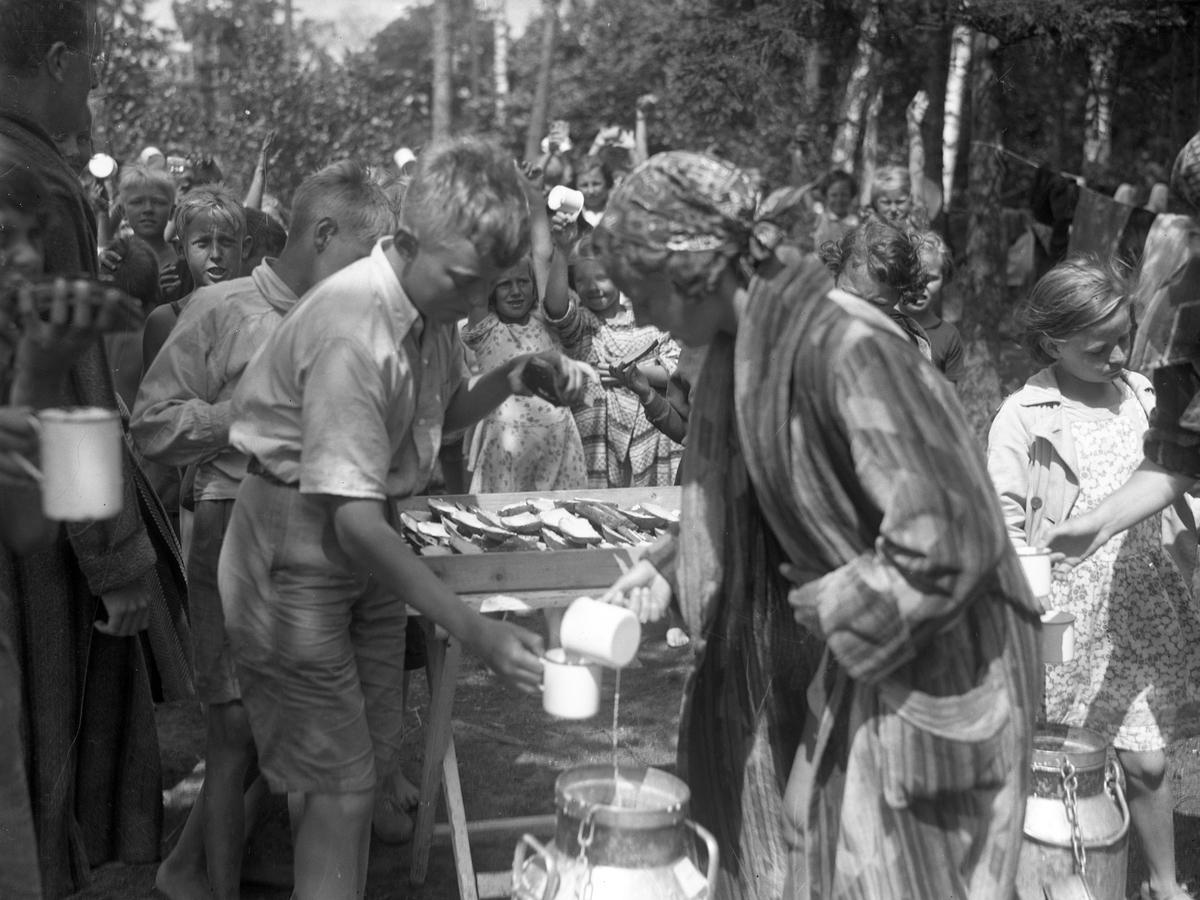 Karlstad stads barnläger vid Alsters strandbad år 1936. Den ursprungliga förlagan till senare tids Bomstads-, Örsholms- och Sundstaläger.