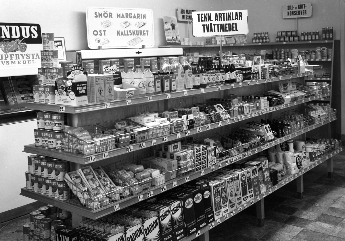 Bildsvit från Frits Thybergs speceriaffär på Kvarnberget, kanske ett av Karlstads första snabbköp. Butiken fanns på Jössegatan 7 där ett politiskt parti nu är hyresgäst. Bilden tagen år 1951.