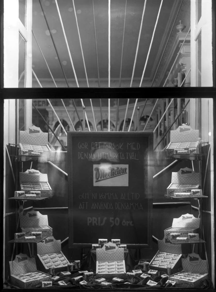 Skyltning i bröderna Martins butik på Västra Torggatan 11 runt 1930.