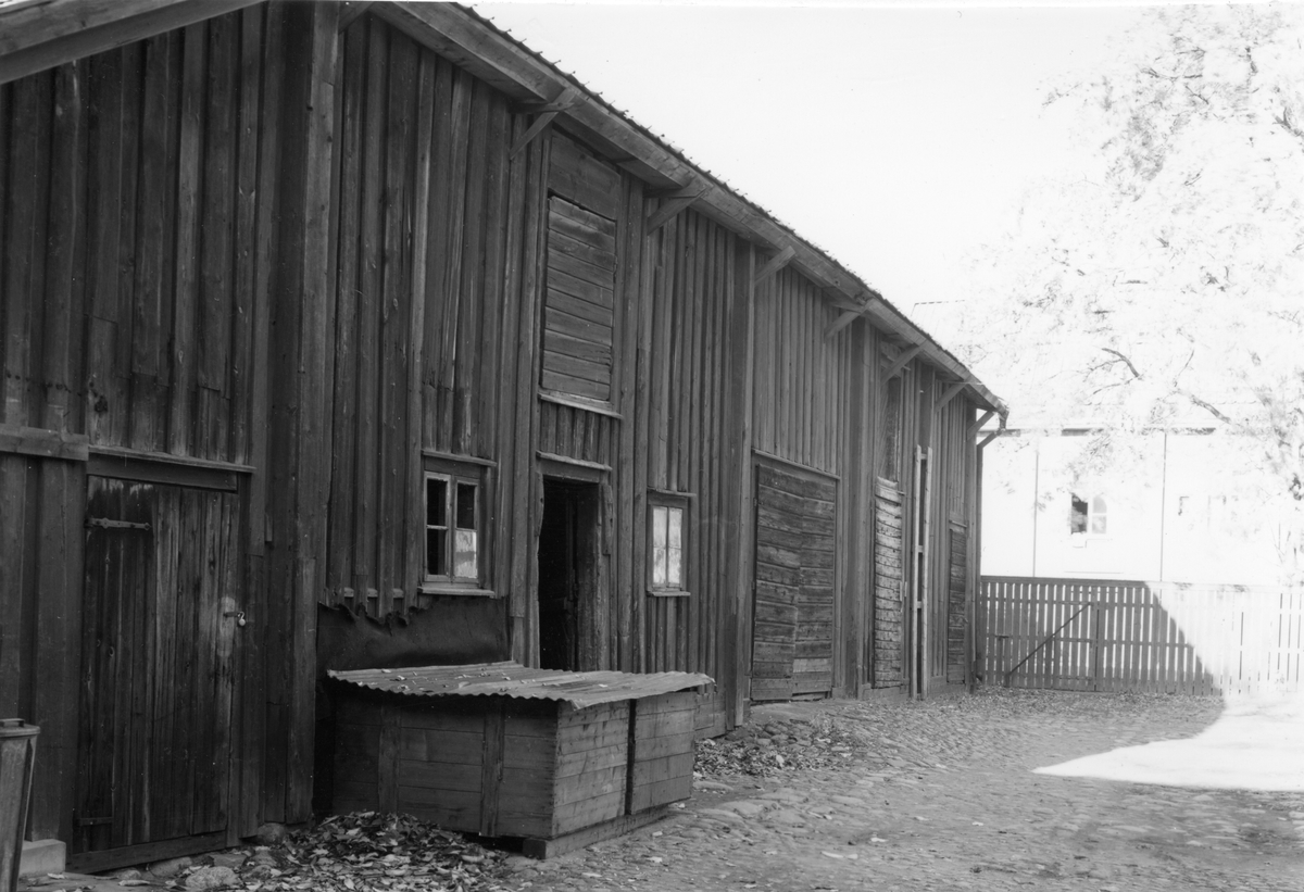 Kvarteret Almen i Karlstad: Uthuslänga tillhörande Landshövdingegården på adressen Älvgatan 7. Bilden tagen 1956.