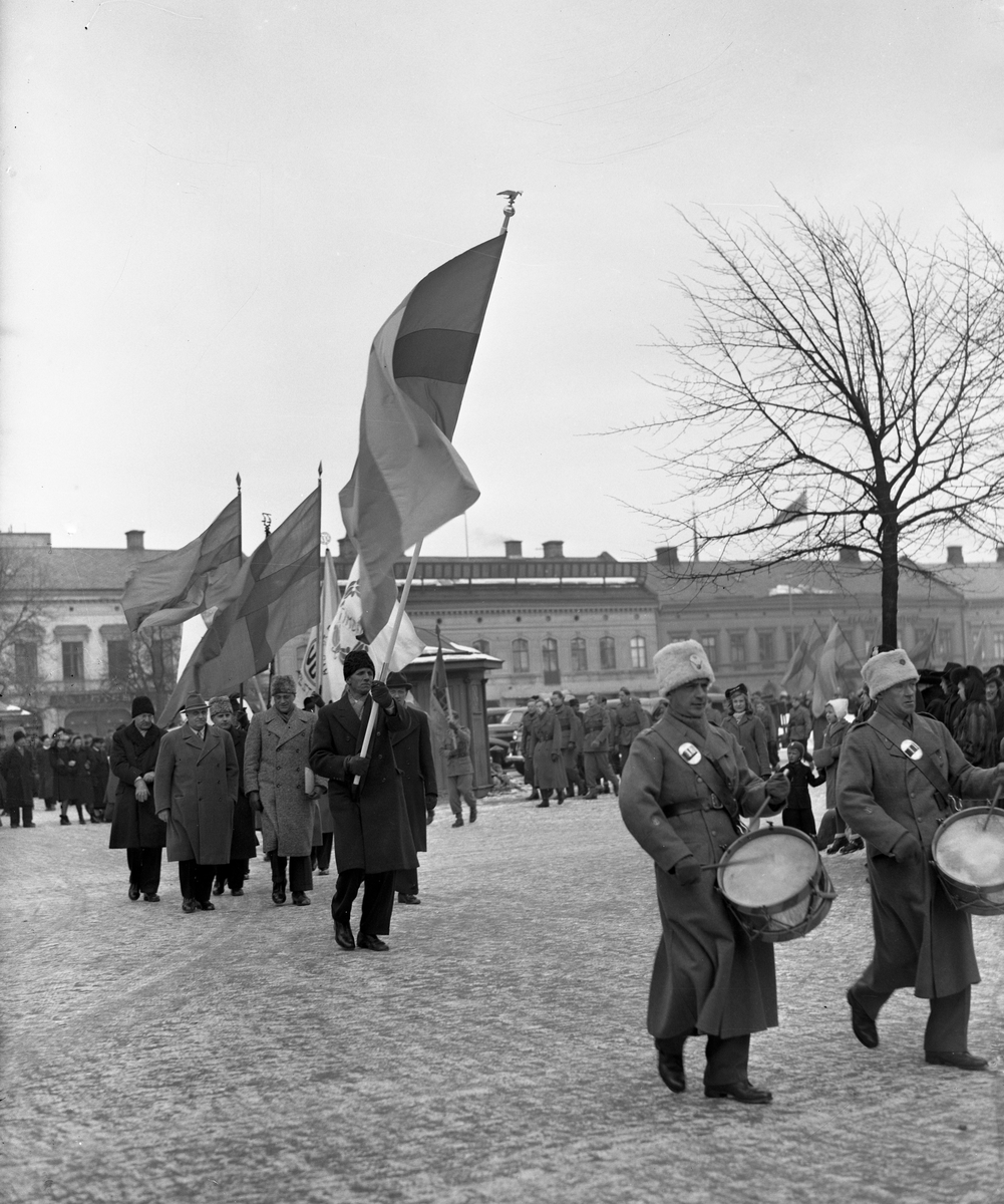 Demonstrationståg med uppmaning till allmänheten att ansluta sig till försvarslånet. Detta genomfördes tre gånger 1940-42 av svenska staten för att låna pengar av folket så att man kunde rusta upp försvaret under andra världskriget. I runda slängar fick man in ca 50 miljarder i dagens penningvärde (2012).