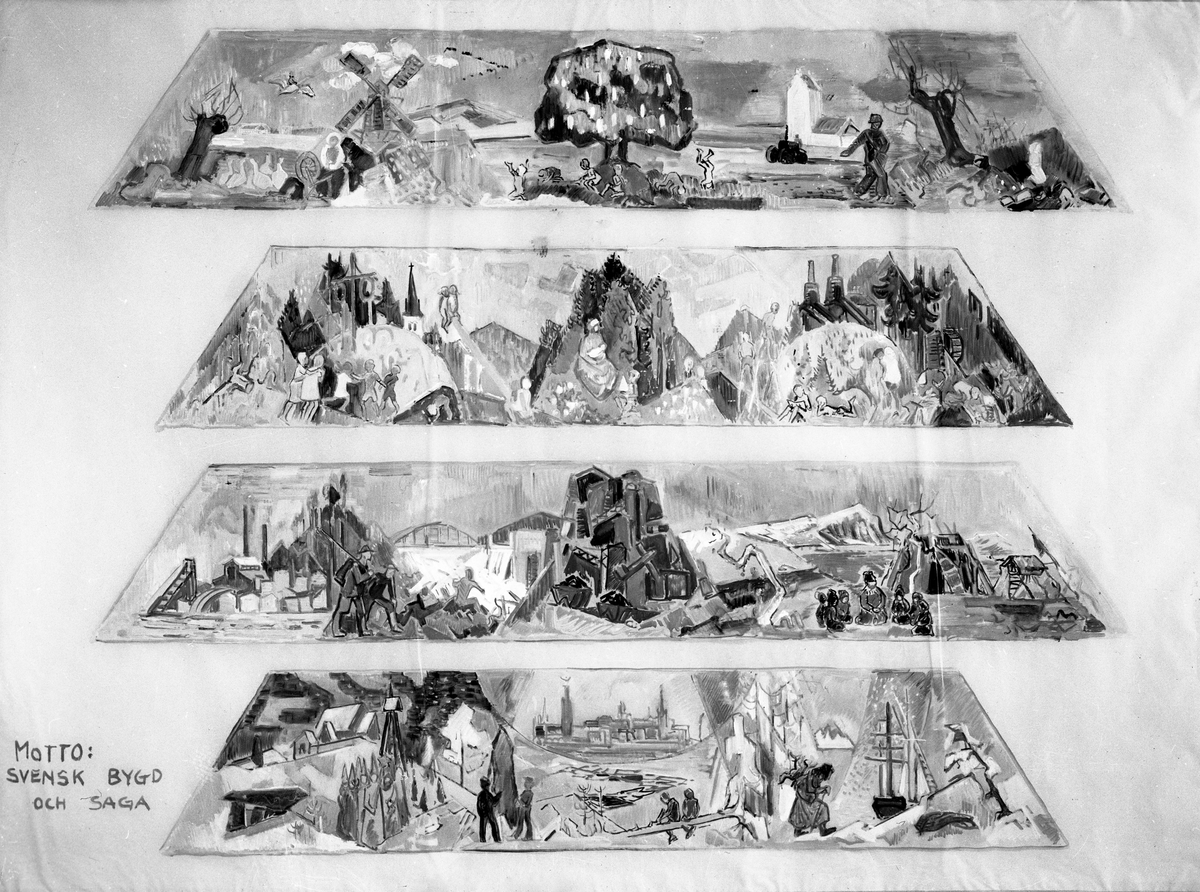 Konstnären Simon Sörmans vinnande förslag till ny utsmyckning av Herrhagsskolans aula vid renoveringen i slutet av 1940-talet. Bilden beställdes av överlärare Gustaf Starck.