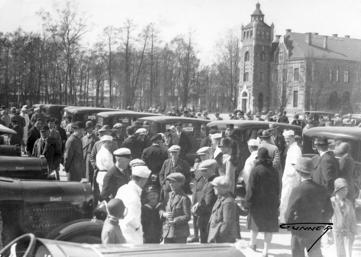 Publik och fordon med tingshuset i Klara i bakgrunden på tidigt 30-tal