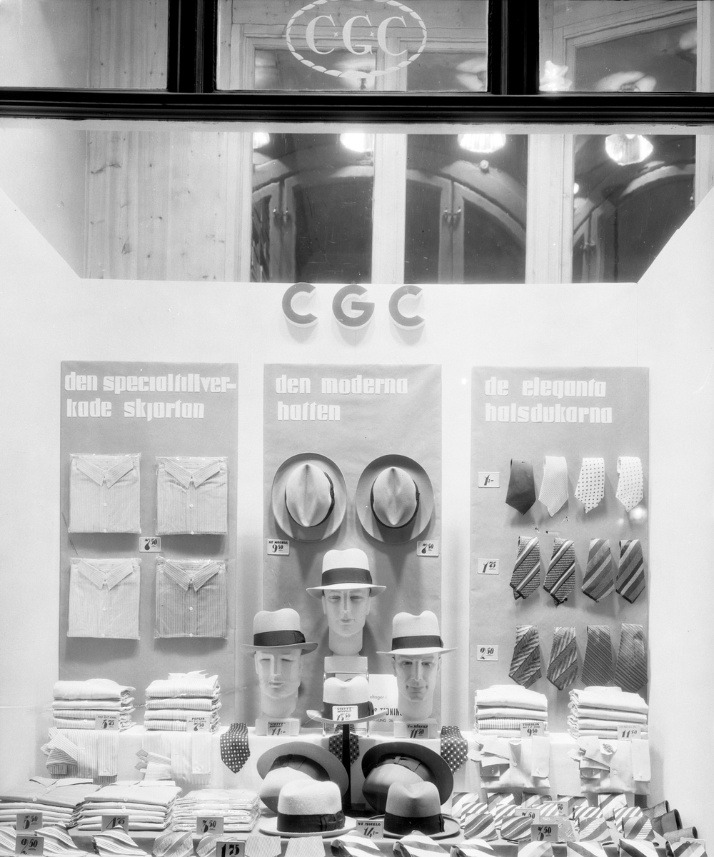 CGC-skyltning i maj 1934. När bilden togs låg butiken på Kungsgatan 20 och 1951 gick flytten till Drottninggatan.