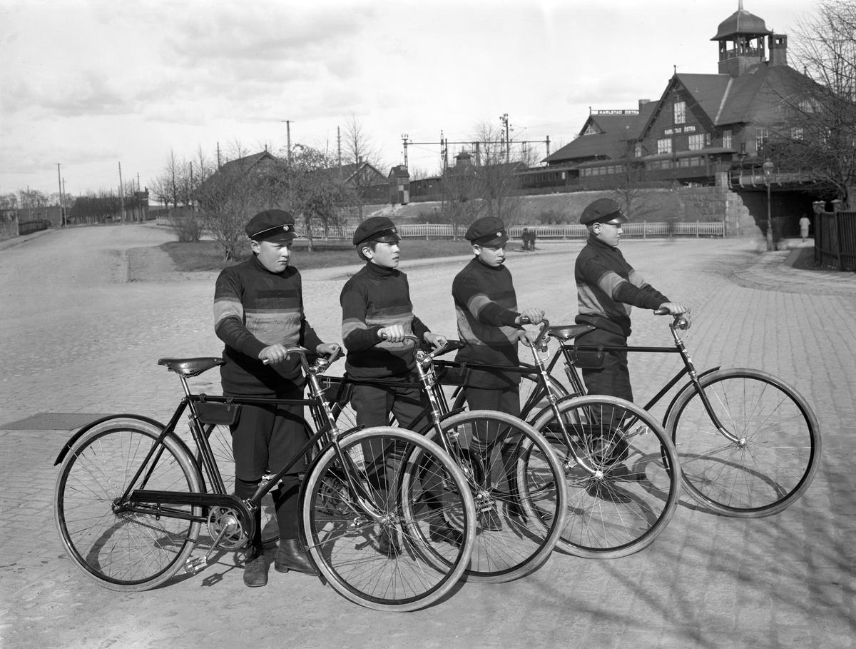 Titel: Läroverksgrabbar gör reklam för cykelmärket Hermes som saluförs av Österbergs järnhandel i Haga.
