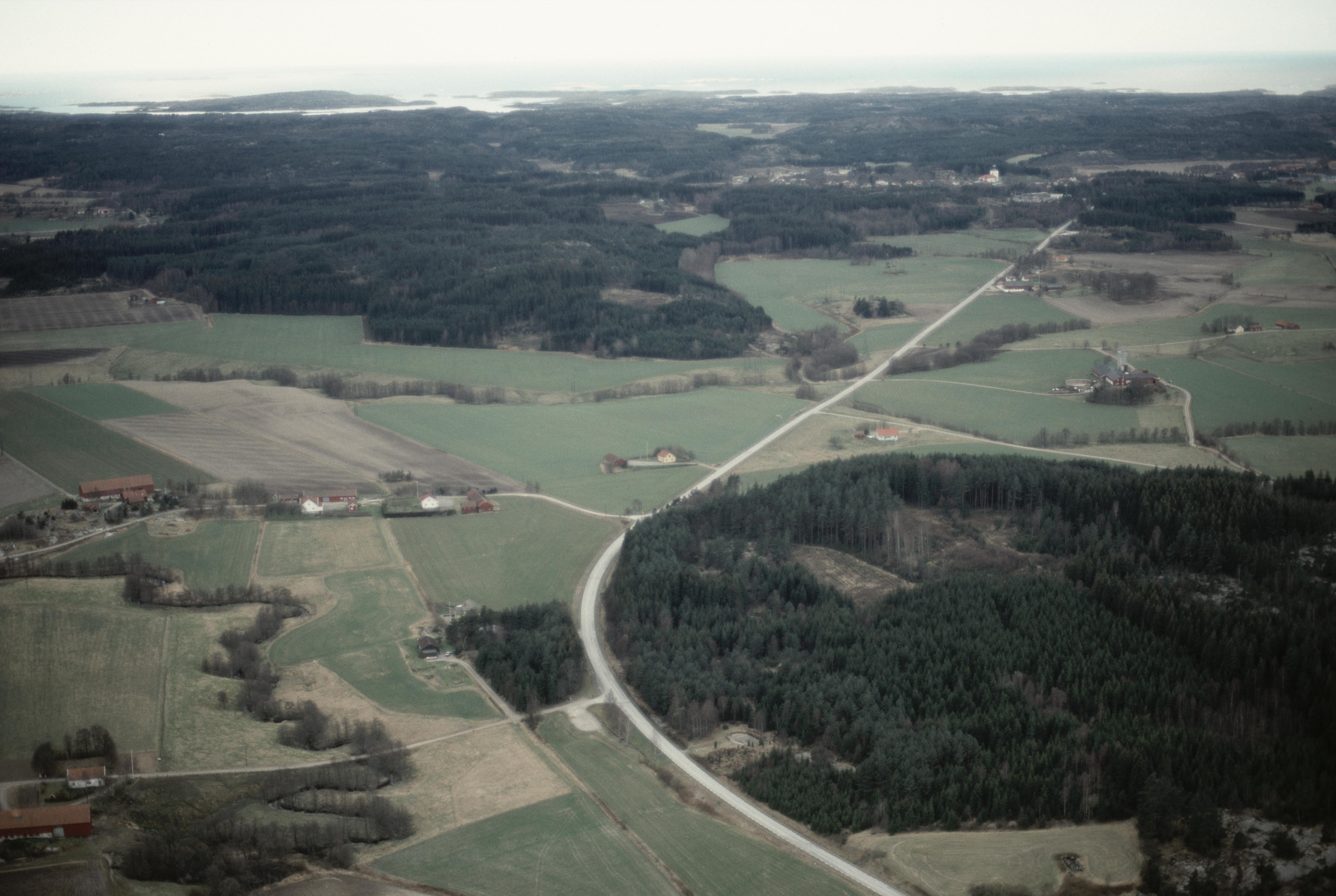 Tanumsslätten. Gramseälven till vänster. Hällristningsområde i fornlämningsrik dalgångsbygd. Hällristning RAÄnr Tanum 149:1, 255:1, 261:1 m.fl. vid bildens mitt. Bilden är tagen mot (väderstreck): SV