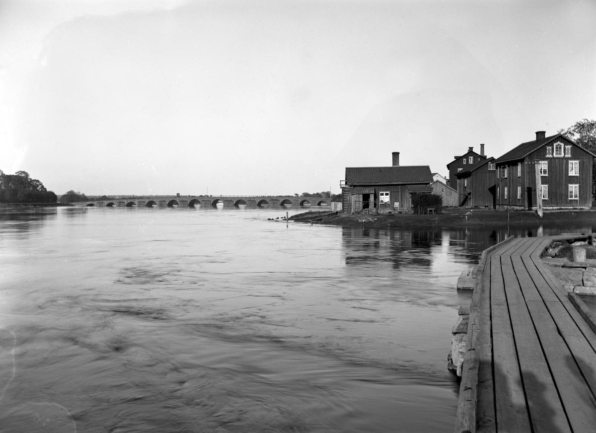 Högt vattenstånd i Klarälven, här vid inflödet till pråmkanalen, på en bild tagen runt förra sekelskiftet.